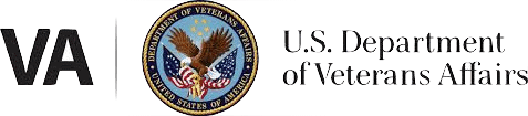 Official US Department of Veterans Affairs VA branding featuring the bold VA acronym a vertical separator the circular VA seal with an eagle emblem and the full US Department of Veterans Affairs text all on a gray background
