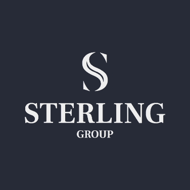A silver Sterling Group logo features a stylized fluid S emblem above STERLING serif and GROUP on a dark background This elegant design represents providers of hurricane shutters in Wilmington Topsail Oak Island and Myrtle Beach