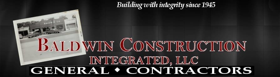 Baldwin Construction Integrated LLC banner maroon text on a dark background featuring Building with integrity since 1945 a vintage building photo and General Contractors Specializing in durable construction including hurricane shutters for Topsail Wilmington Oak Island and Myrtle Beach