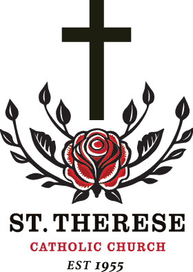 Classic St Therese Catholic Church logo on maroon featuring a dark cross vibrant red and white rose within dark foliage and text ST THERESE CATHOLIC CHURCH EST 1955