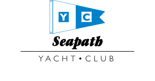 A distinctive Seapath Yacht Club logo features a blue and white YC burgee above elegant Seapath script and YACHT CLUB text This classic nautical emblem in blue white and black is framed by a hand drawn blue ellipse suitable for sailing and yachting organizations