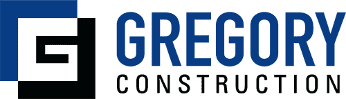 Modern Gregory Construction logo on a dark navy background It features a black and blue stylized G emblem with GREGORY in bold blue and CONSTRUCTION below Professional design for building and hurricane shutter installation in Wilmington Topsail Oak Island Myrtle Beach