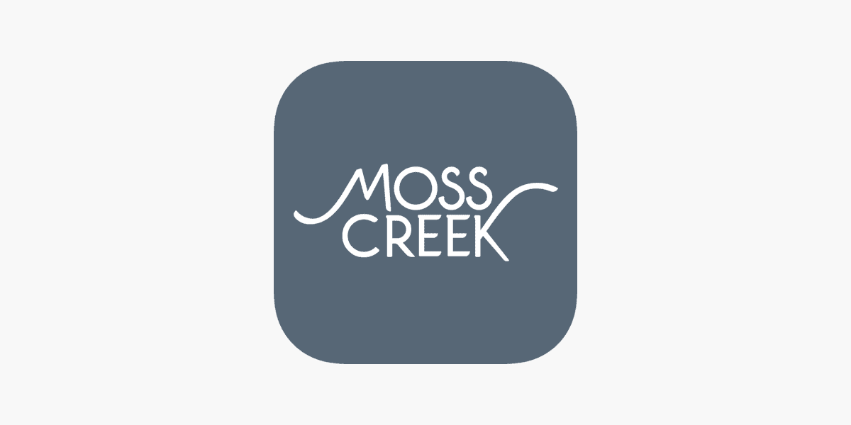 Elegant MOSS CREEK logo featuring stacked white text on a soft blue grey rounded square MOSS uses a graceful script with flourishes while CREEK is a clean sans serif conveying a sophisticated and natural brand identity ideal for modern business logo design