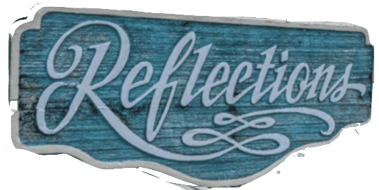 A decorative teal distressed wood sign with an ornamental scroll shape displays Reflections in elegant white calligraphic script This Wilmington decor piece offers vintage charm