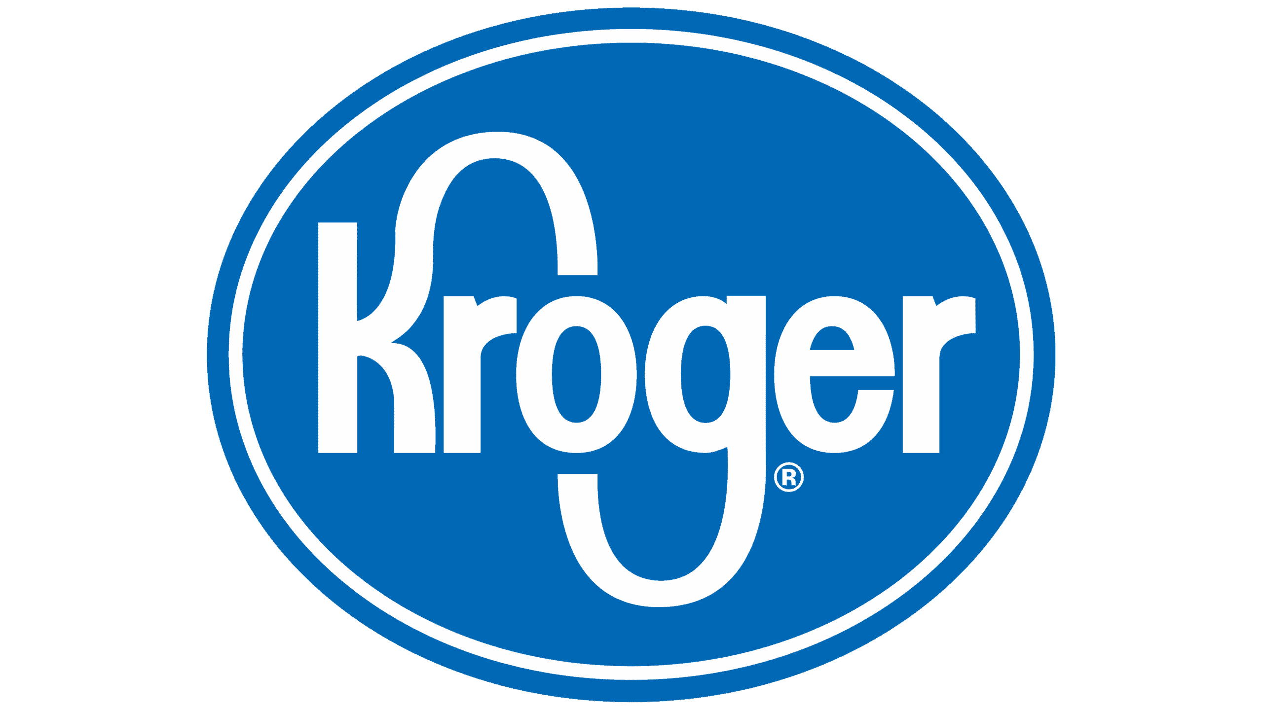 The vibrant Kroger supermarket logo features a stylized white Kroger script with an elongated K inside a prominent white oval all set against a rich royal blue background representing the grocery store brand