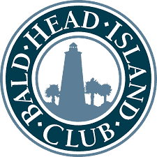 The Bald Head Island Clubs circular logo features a deep blue outer ring with club name framing a white center with a silhouetted lighthouse and palm trees It symbolizes coastal life near Wilmington Topsail and Oak Island where hurricane shutters are essential