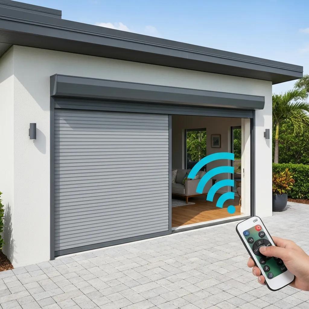 close up of a motorized roll down hurricane shutter being deployed with a remote control 054caab0 730f 4068 ba22 18f4616ab924webp