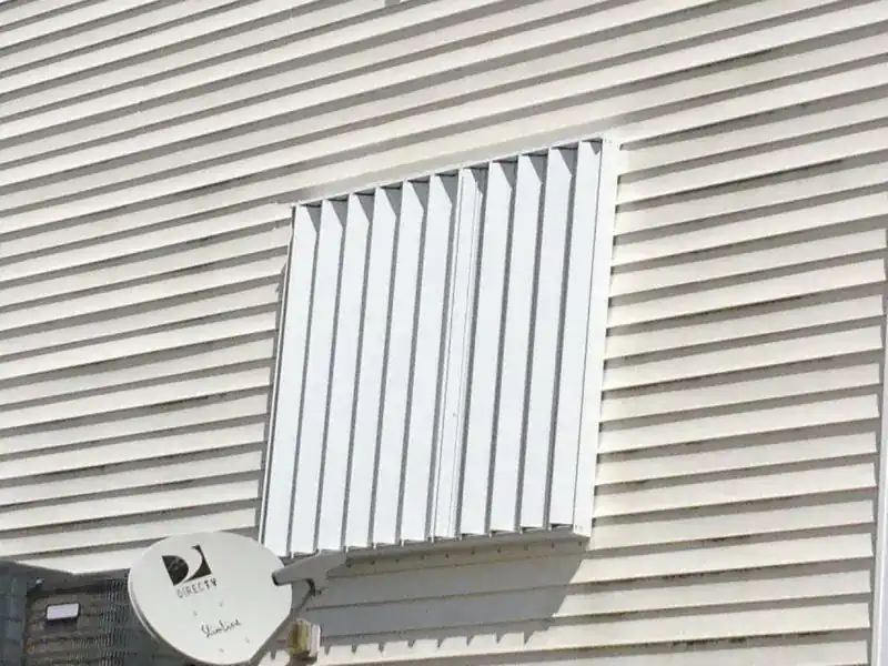 Bright white building features a window covered by vertical hurricane shutters casting clear shadows in daylight A DIRECTV dish is visible suggesting coastal property preparedness for Wilmington Topsail Oak Island or Myrtle Beach