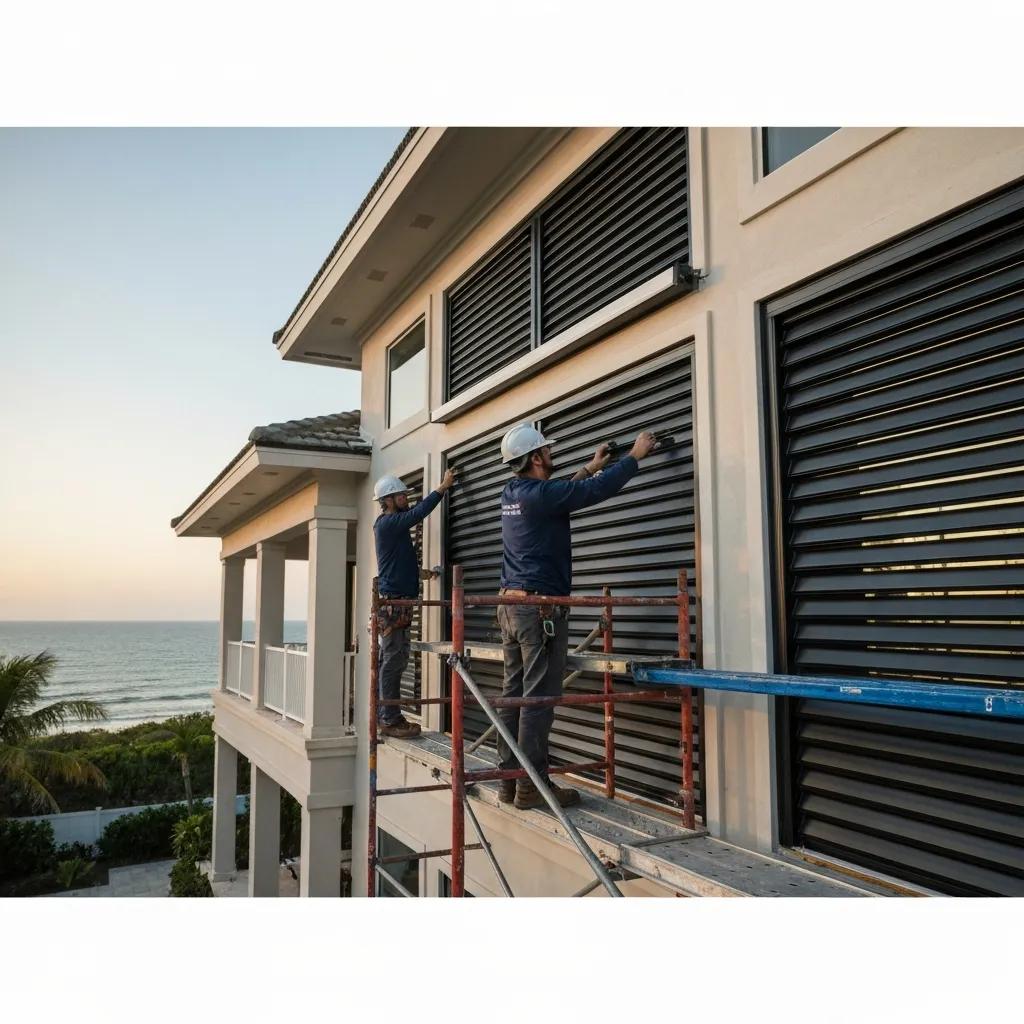 professional installers working on accordion shutter installation on a coastal home 9049318c 30e5 4159 9c1e 2986777e657fwebp