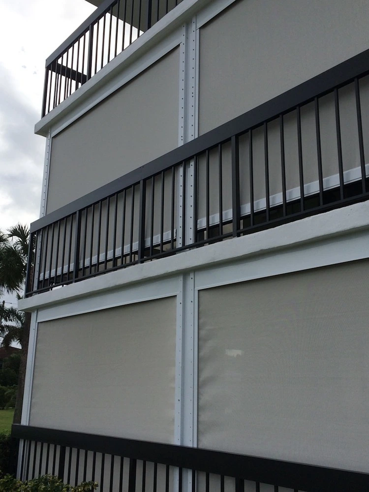 Motorized StormTex hurricane screens enclosing a lanai in Barefoot Resort Deflects wind driven rain and debris without obstructing the view of the golf course