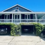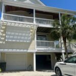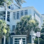 A two-story blue beach house with white trim, featuring large windows with shutters. There is a wooden garage door on the lower level. Palm trees surround the property, and the sky is clear with a few clouds visible. The house number “123” is displayed near the entrance. in either North or South Carolina